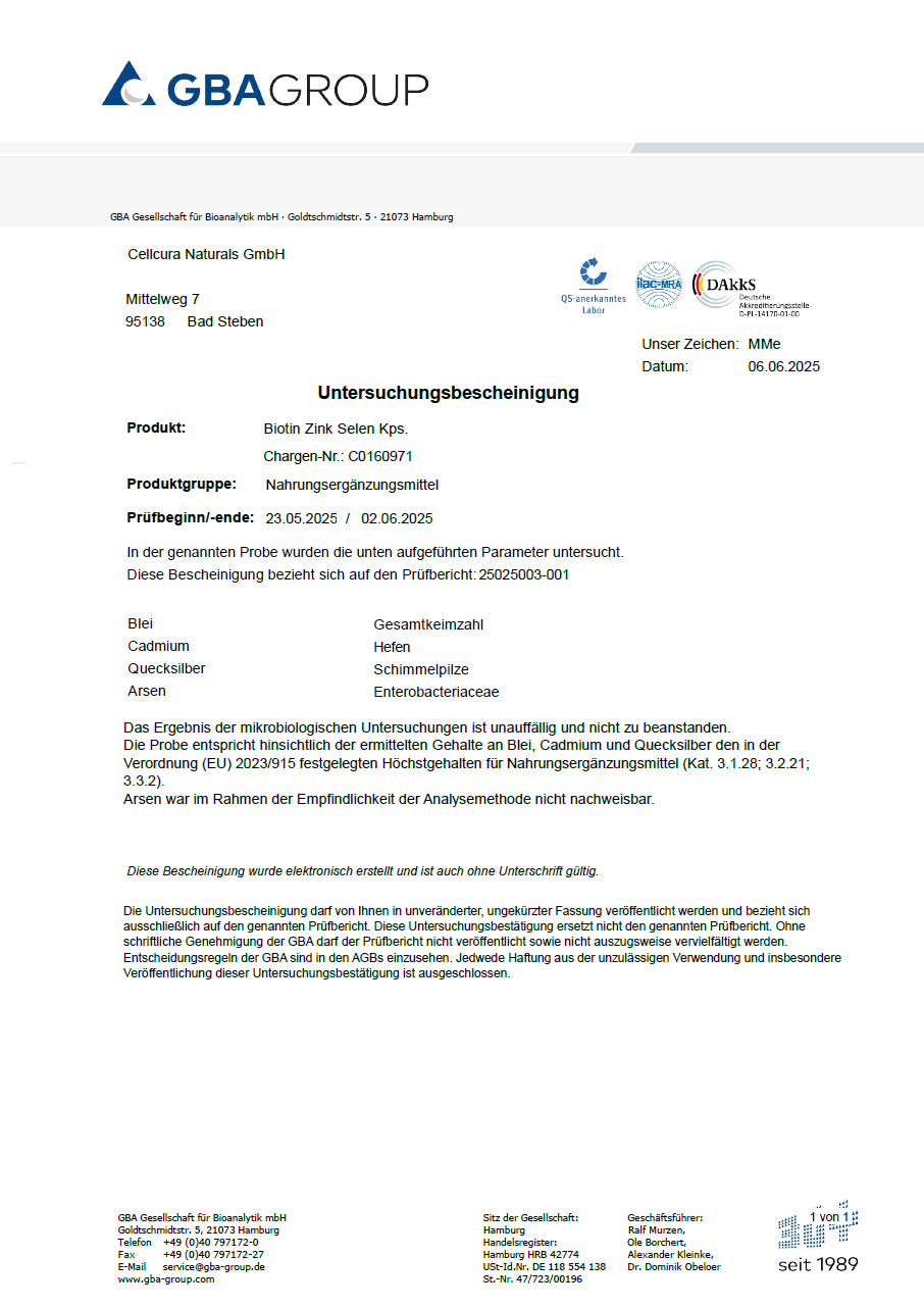 Die Qualität unserer Produkte hat für uns höchste Priorität. Deshalb lassen wir unsere Produkte regelmäßig von einem unabhängigen Labor prüfen. Dabei werden unter anderem Schwermetalle wie Blei, Cadmium, Quecksilber und Arsen sowie mikrobiologische Parameter wie Gesamtkeimzahl, Hefen, Schimmelpilze und bestimmte Bakteriengruppen geprüft. So stellen wir sicher, dass unsere Produkte den gesetzlichen Anforderungen entsprechen und unseren eigenen hohen Qualitätsansprüchen gerecht werden.