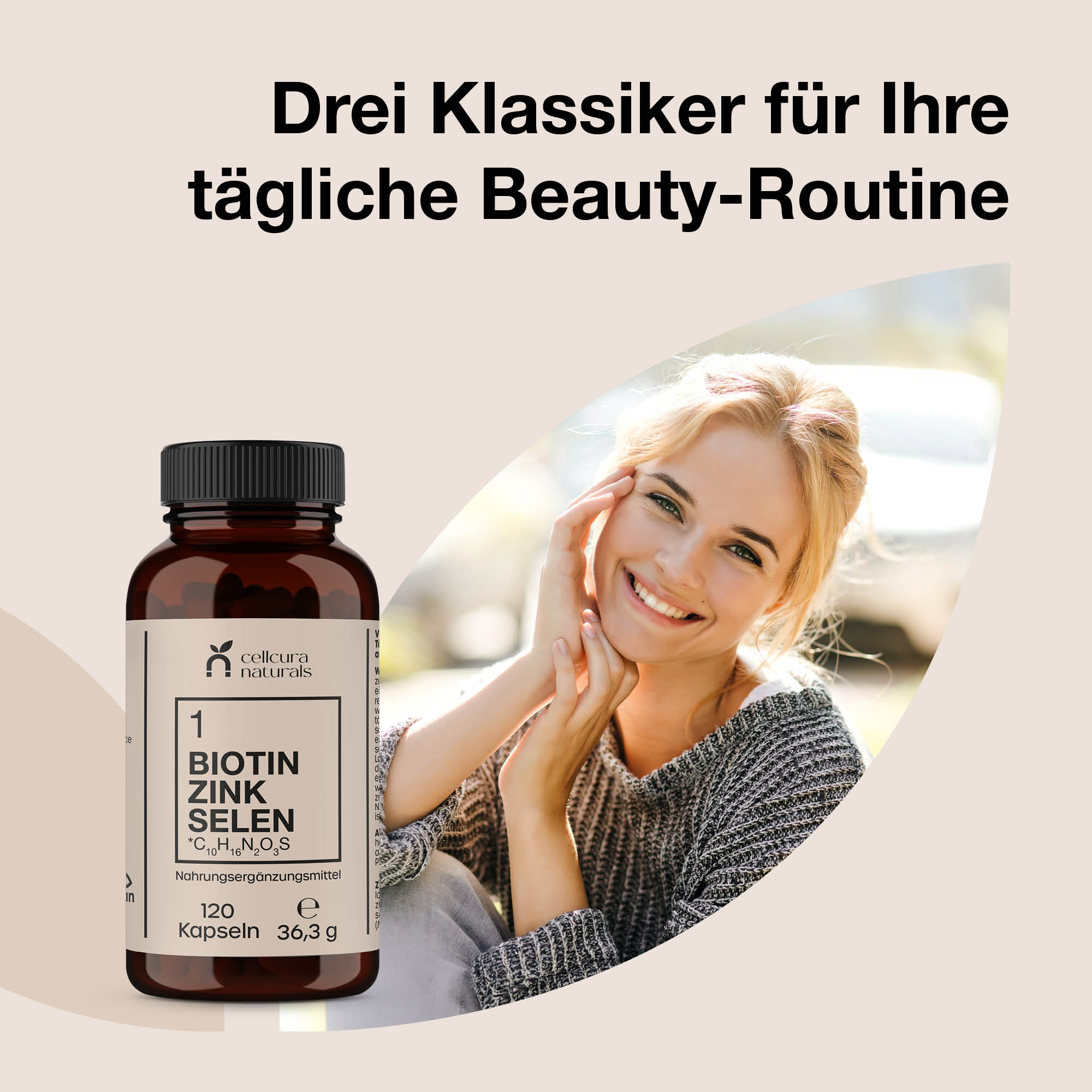 Strahlende Schönheit beginnt im Inneren. Die Kombination aus Biotin, Zink und Selen versorgt den Körper mit wichtigen Mikronährstoffen für Haut, Haare und Nägel. Biotin, häufig als Schönheitsvitamin bezeichnet, trägt zur Erhaltung normaler Haut und Haare bei. Zink unterstützt Haut, Haare und Nägel, während Selen zur Erhaltung normaler Haare und Nägel sowie zum Schutz der Zellen vor oxidativem Stress beiträgt4.