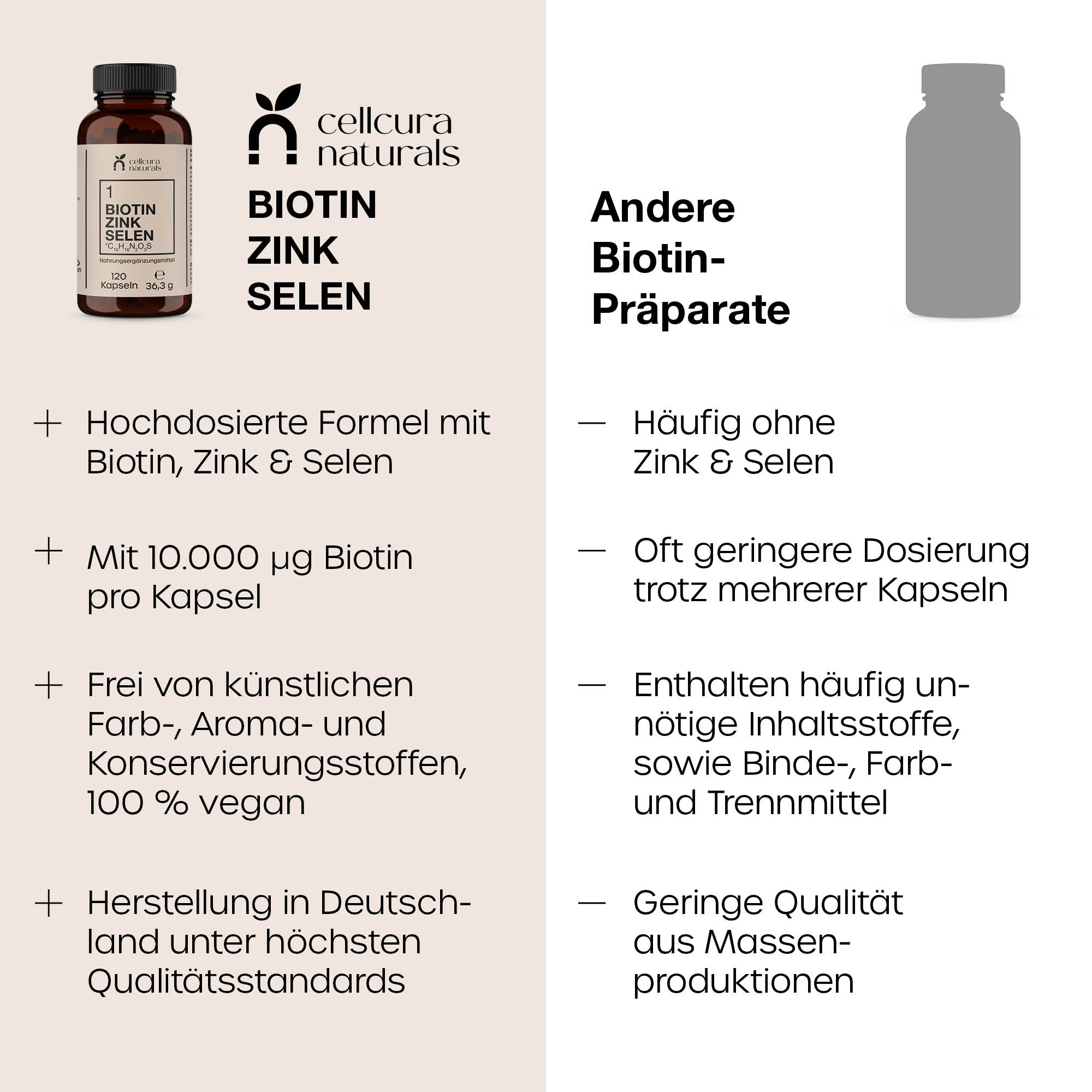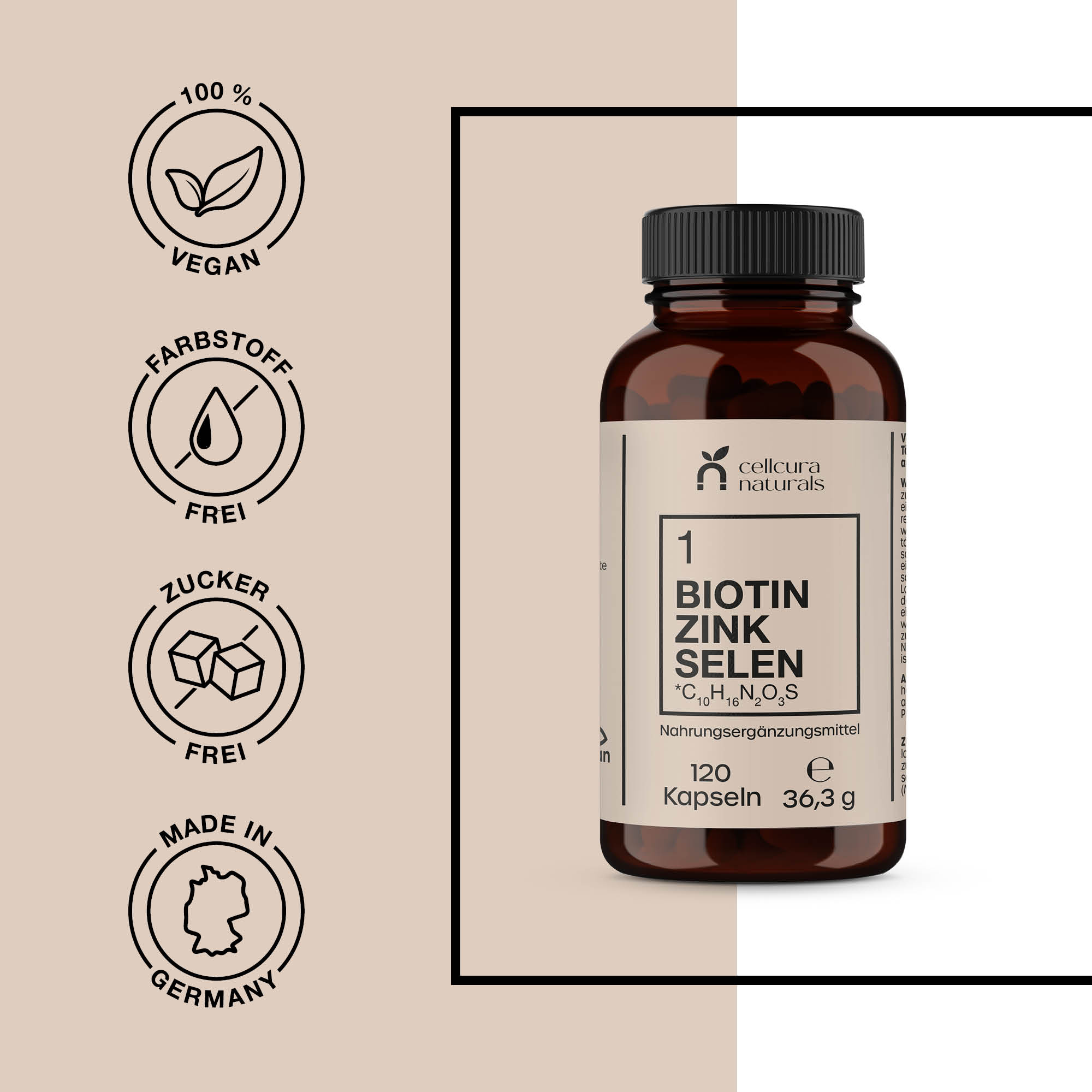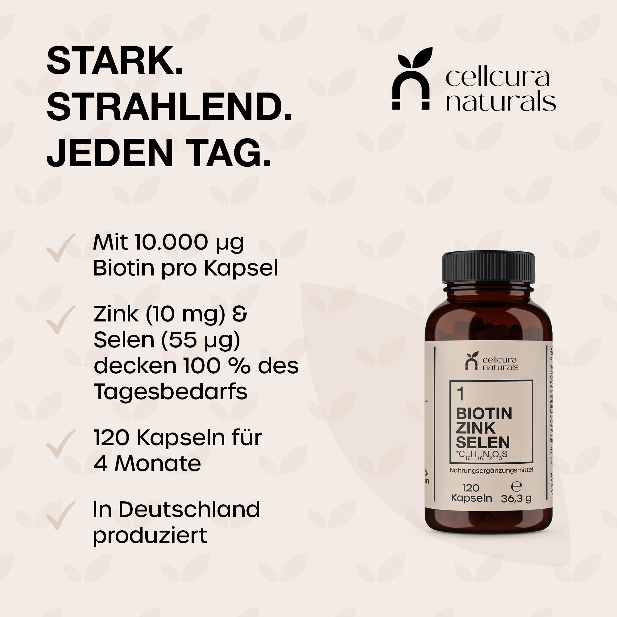 Biotin Zink Selen von cellcura naturals kombiniert drei essenzielle Mikronährstoffe zur Erhaltung normaler Haut1, Haare2 und Nägel3.  Hergestellt in Deutschland und frei von überflüssigen Zusätzen, ist ideal für alle, die Wert auf eine klare und unkomplizierte Nährstoffversorgung legen.